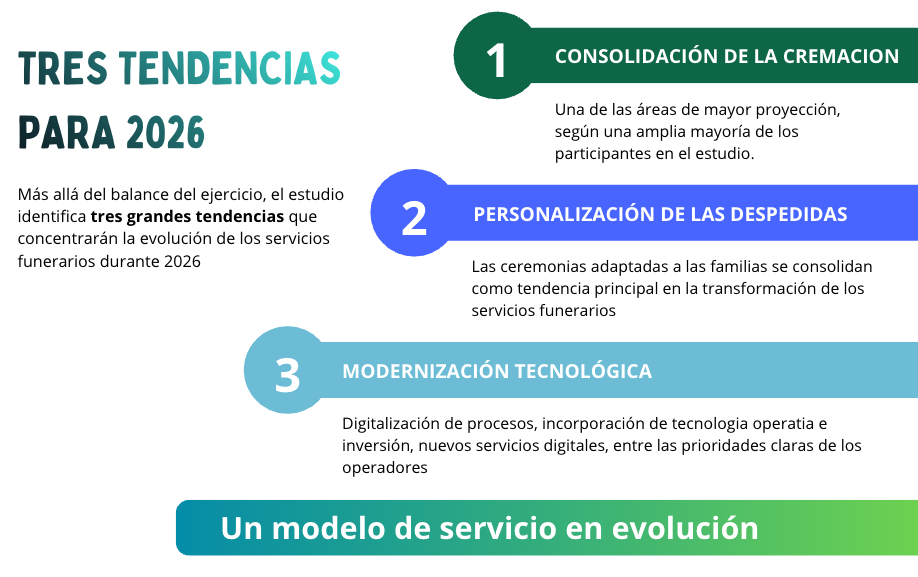 Más allá del balance del ejercicio, el estudio identifica tres grandes tendencias que concentrarán la evolución de los servicios funerarios durante 2026.
